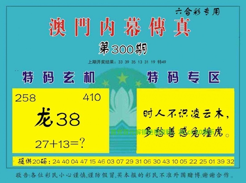 | 300期 | 马 | 蓝单 | 3头 | 7尾 | 开虎40 |